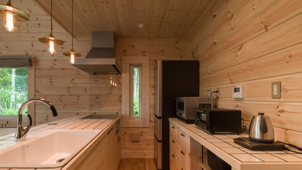 屋根付きのBBQ場で、天候を気にせず気軽にBBQを楽しめます。屋外用のミニキッチンも完備。準備や片付けの負担が少ない設備で、自然の空気を感じながら心地よい時間を過ごせます。